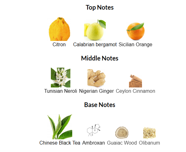 • Base notes: Chinese Black Tea, Ambroxan, Guaiac Wood and Olibanum